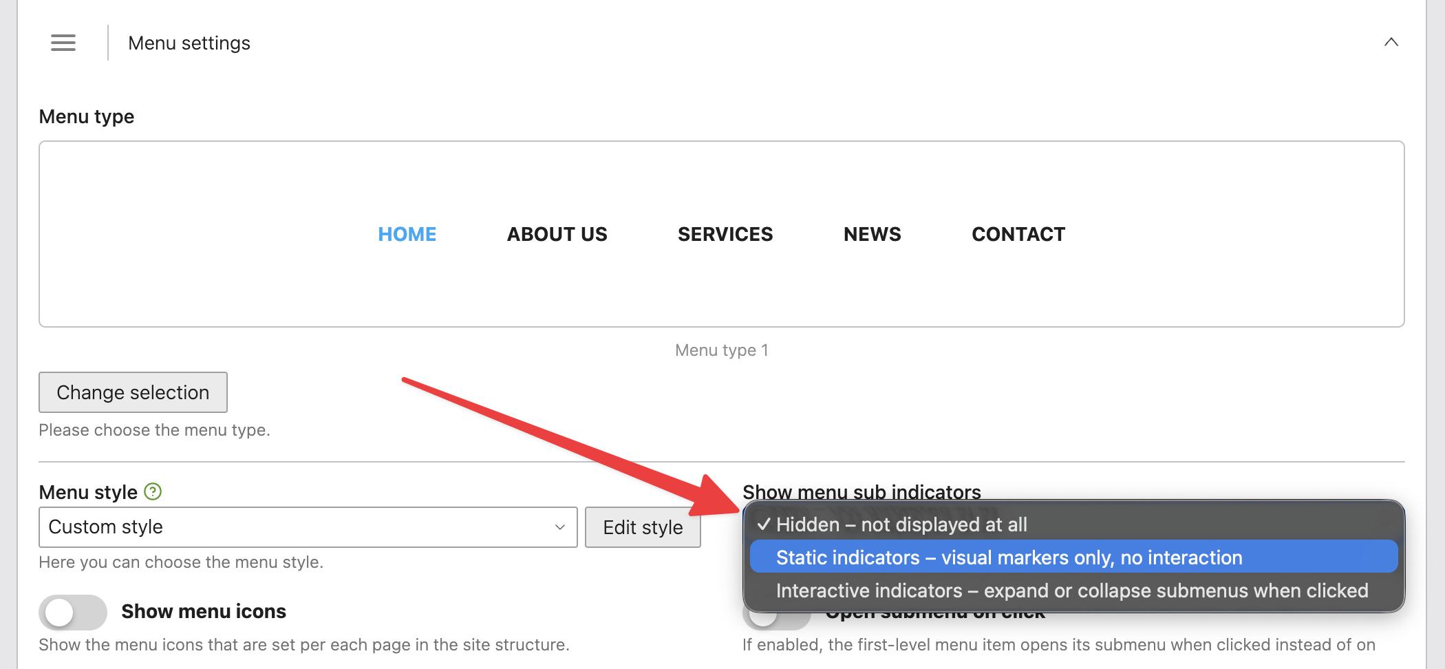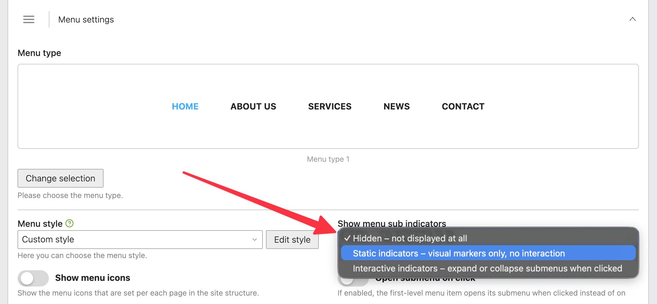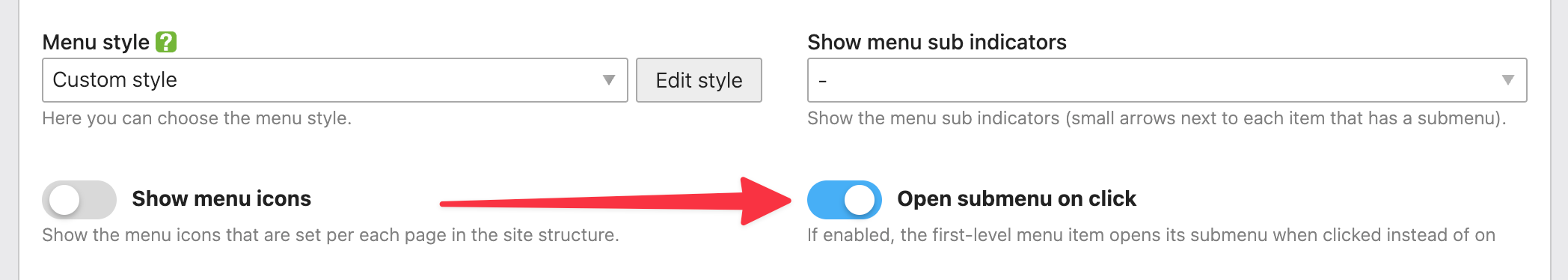 You can now configure first-level navigation links to expand submenus on click instead of hover. This is especially useful for touch devices or when aiming for a more controlled navigation experience.