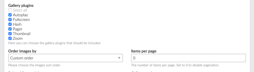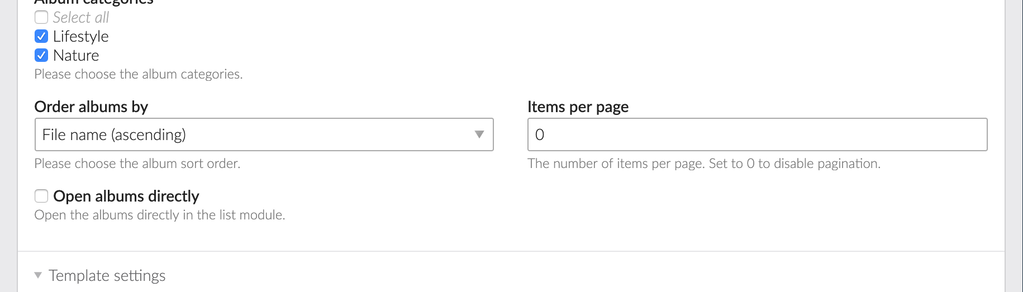 The Photo Album extension allows you to choose the desired categories to display in the frontend modules settings. It also allows for a configurable list of enabled gallery plugins, including autoplay, full screen, hash, page, thumbnail, and zoom. You select choose various sort orders and pagination for your images.